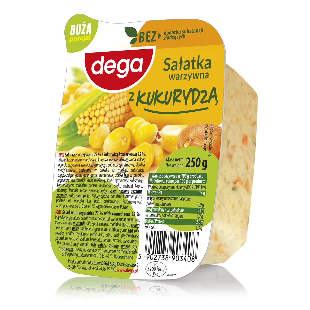 Sałatka z warzywami 73 % z kukurydzą konserwową 12 %. Główne składniki: ziemniaki, marchew, kukurydza, olej rzepakowy, woda, cukier, ogórek, przyprawy (zawierają gorczycę), sól, ocet spirytusowy, skrobia modyfikowana, śmietana w proszku (z mleka); żółtko jaja w proszku, regulatory kwasowości: kwas mlekowy, kwas cytrynowy; substancje konserwujące: sorbinian potasu, benzoesan sodu; ekstrakt kopru.
