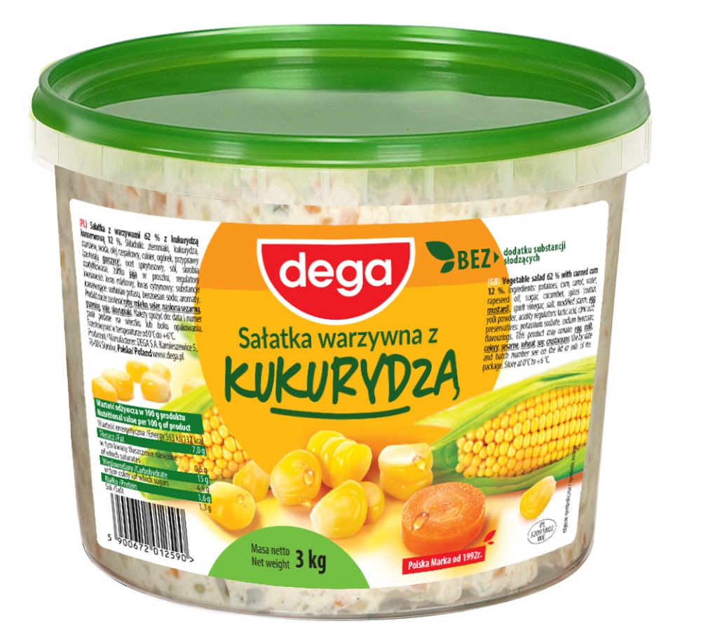 Sałatka warzywna z kukurydzą z dodatkiem ziemniaków, marchewki, ogórka, i cebuli. Wszystkie warzywa doprawione i połączone majonezem. Produkt może zawierać mleko, seler, sezam.